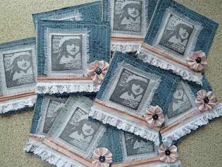 Over on UKS I had joined in another swap, this time to make 'fat pages' in other words a page that is not flat. The pages could be anything we wanted but they had to be 4x4. I went with a fabric theme, I used an old pair of jeans as my background which I stitched onto some card, then I added a script stamp, I stamped an image onto some muslin cloth and frayed the edges a little, put a tiny bit of wading behind to make it 'fat' before stitching onto the denim, added a little lace as I thought it made it nicer. I made a flower out of some ribbon and stitched on a button. I was pleased with how they turned out but I realize how bad my eye sight has gotten when I was tidying up the threads and stitching the ribbon flower I could hardly see the needle to get it threaded, oh the joys of getting older!